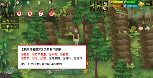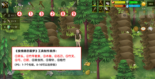 开局制作工具的先后顺序:①斧头、②竹竿套索、③木锄、④石刀、⑤竹叉、⑥弓、⑦箭、⑧除虫剂、⑨骨针、⑩炮竹