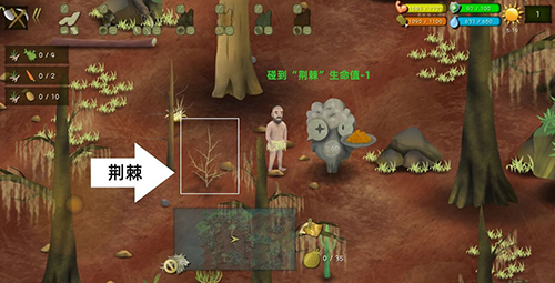 ①大家要小心红土地上面的荆棘,碰一下生命值-1,也要小心任何动物,里面的蝎子扎一下都要扣生命值。