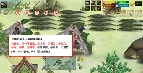 开局制作工具的先后顺序:①斧头、②竹竿套索、③木锄、④石刀、⑤竹叉、⑥弓、⑦箭、⑧鱼竿、⑨除虫剂、⑩骨针、11炮竹。